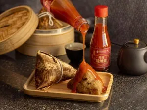 主廚自製「天成好運甜辣醬」,以黃金比例打造紅潤色澤與香甜微辣的滋味,搭配粽子食用不僅開胃更添風味!