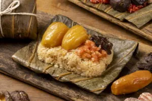 而現代人注重養生訴求健康飲食,天成端陽素粽禮盒遴選三款特色素粽,「紅麴香糯蔬食粽」以營養豐富的「紅麴」為基底拌入糯米飯,豐富的餡料包含鬆軟的芋頭與蓮子以及肥厚多汁的香菇,美味零負擔,深受消費者喜愛,「金桔甘薯甜蜜粽」遴選蜜番薯、龍眼肉佐以清香桔餅提味,甜潤果香層層交融,口感細緻不膩,打造溫潤懷舊的香甜滋味,「花生豆皮素香粽」糯米浸潤拌入鬆軟花生與切絲豆皮,慢火蒸炊入味,口感樸實清香、素雅不膩,禮盒搭贈主廚自製全素的「天成好運甜辣醬」,紅潤色澤與香甜微辣的滋味,搭配粽子食用不僅開胃更添風味!