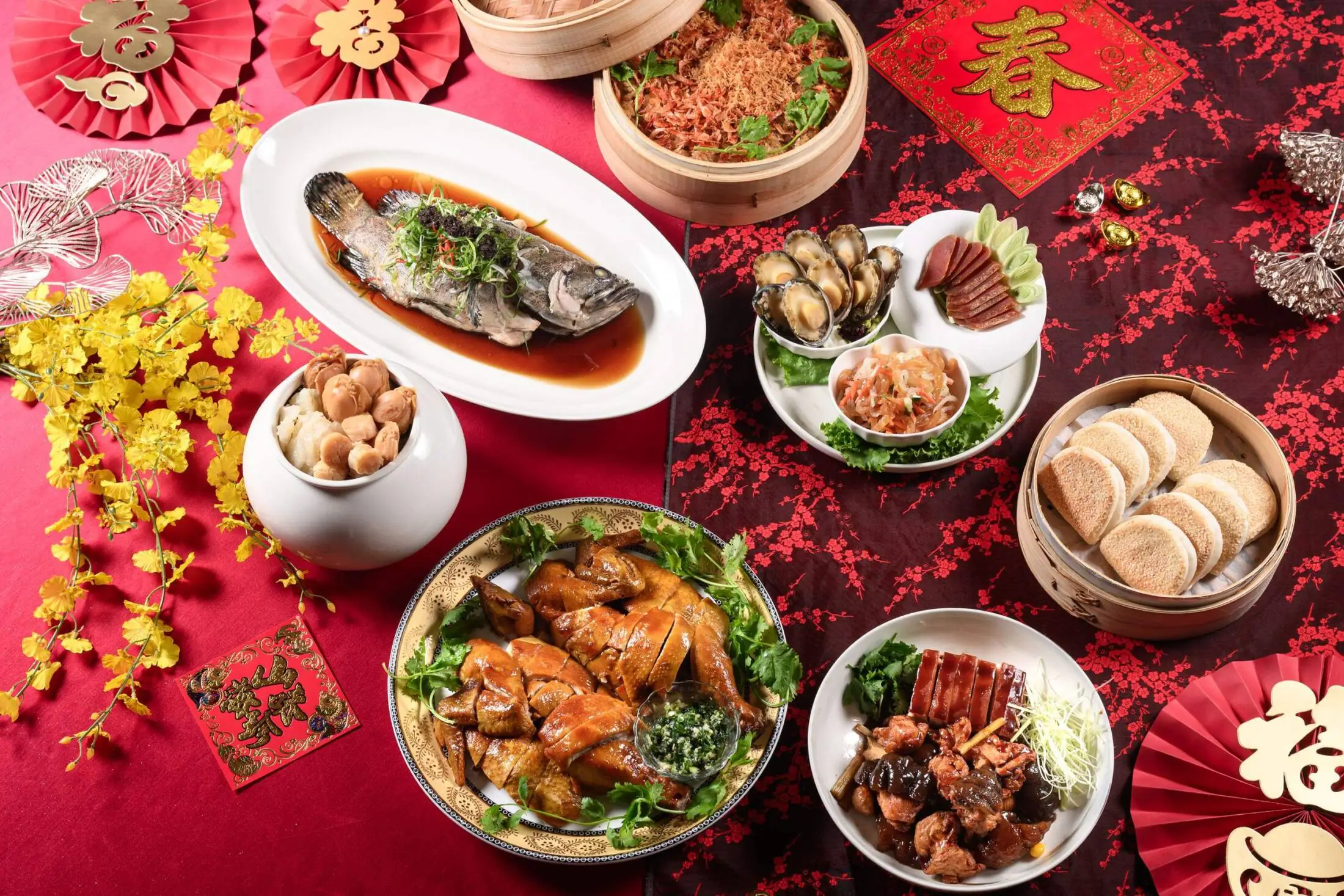 鴻運好三拼、鮑魚干貝花膠佛跳牆、玫瑰露豉油雞、櫻花蝦干貝米糕、富貴虎掌烏參烤方、松露清蒸海石斑