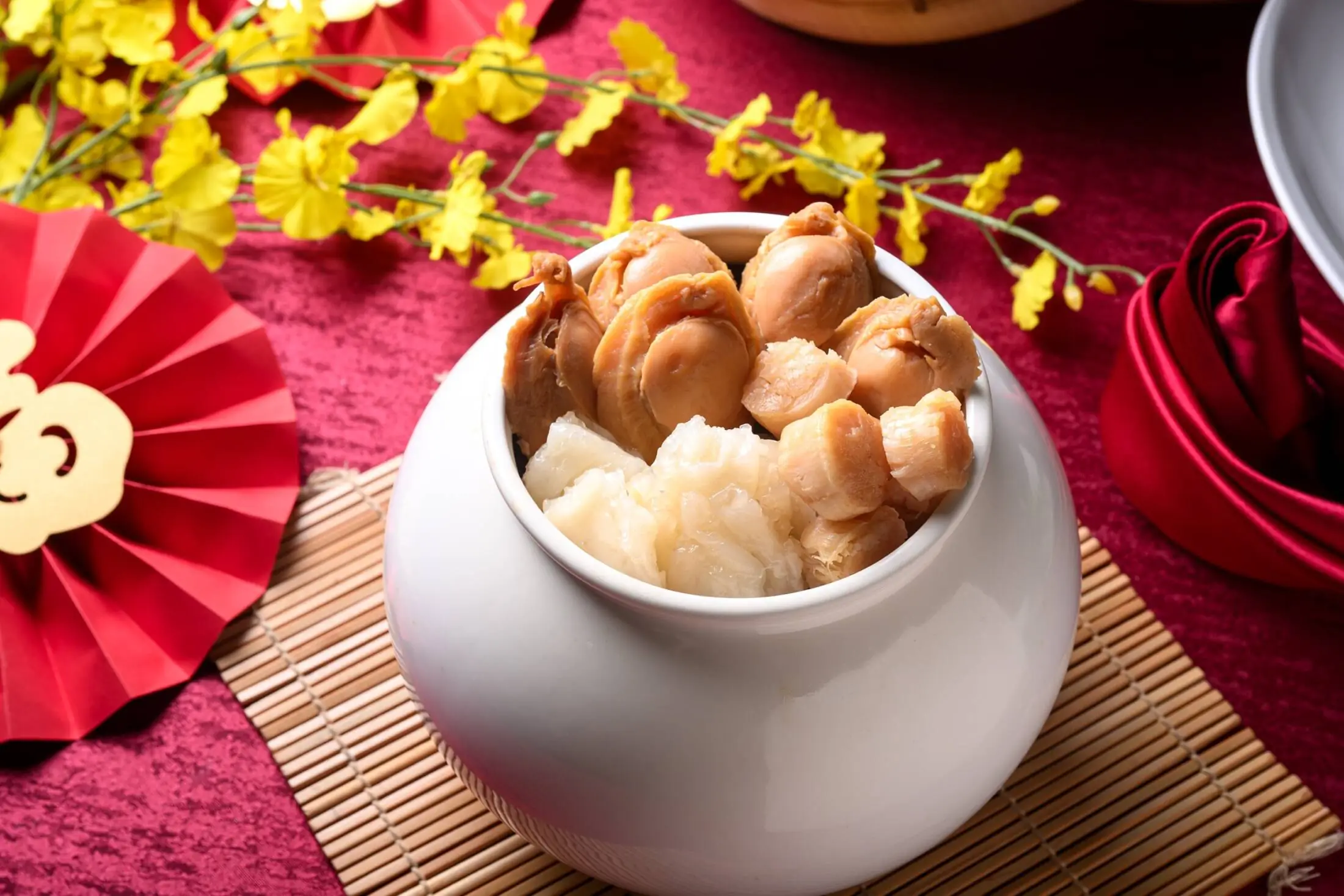 嚴選鮑魚、干貝與花膠慢火熬煮,湯汁濃郁鮮甜,滋味厚實悠長,每一口都滿溢海味精華,滋味格外鮮美,是除夕的必備珍饌。