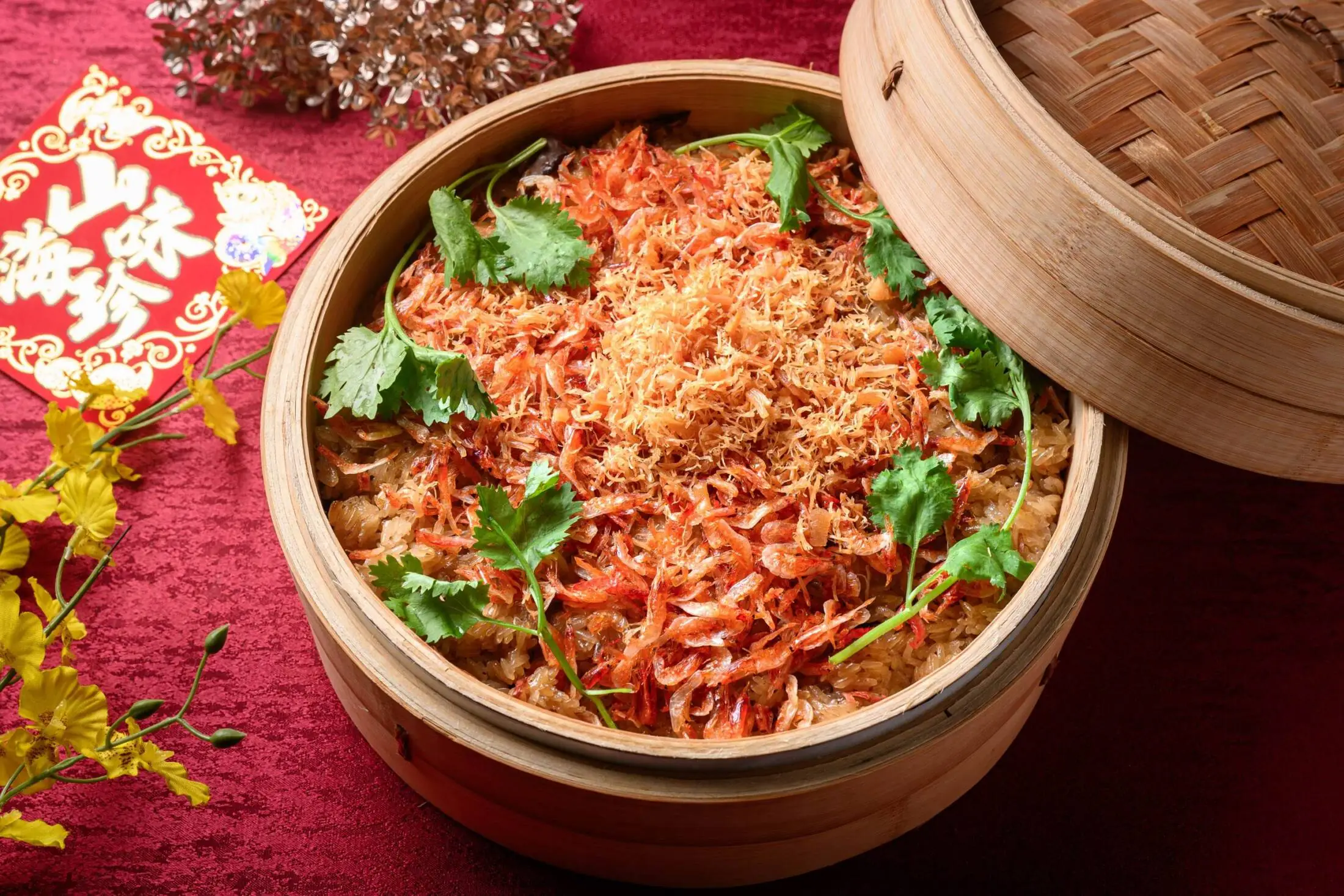 色澤金黃、口感Q彈的油飯,搭配櫻花蝦與干貝等經典食材,海味鮮甜交織其中,口感層次十分豐富,是佳節共享的美味佳餚。